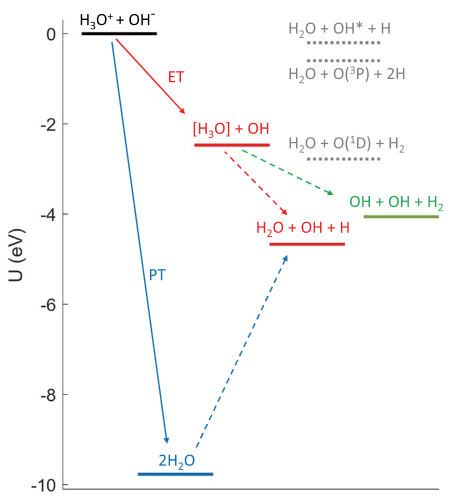 Figure 1: The energetics of the H3O+ +OH− mutual neutralization reaction, which researchers using the DESIREE facility were able to disentangle.