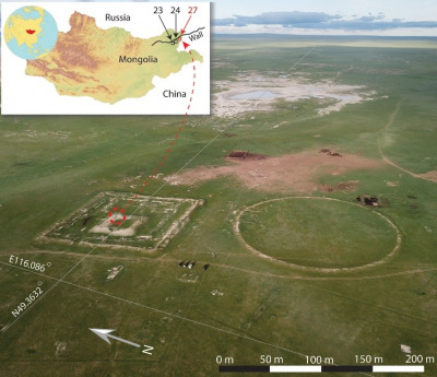 Description: Drone photo of Cluster 27 in northeastern Mongolia. A red circle marks the location of the excavated burial. The inset map shows the location of Cluster 27 in red and two other enclosure sites along the long wall (Clusters 23 and 24) in black.