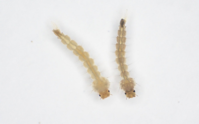 Pupal Stage. The mosquito pupal stage is typically when sexual dimorphism first becomes visible. However, the 'yellow' strain (left) can be immediately distinguished from its naturally dark counterpart (right) regardless of sex, simplifying identification. | Credit: Philippos Papathanos